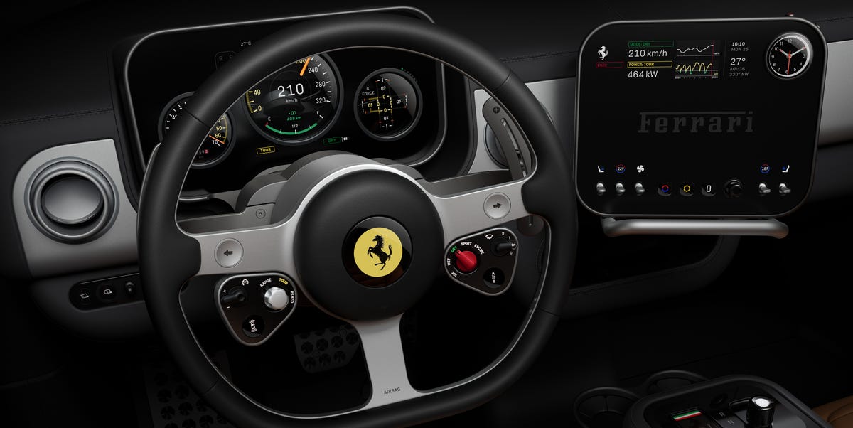 Glass gauges and a proper steering wheel are the sorts of historical concepts near to Ferrari's sentimental heart, but the center console and infotainment screen are where the Luce joins the information age—and where Ive's nearly three decades designing at Apple seeps in. An iPad-style tablet rests in the center of the imaginary cabin, fitted with aircraft-style toggle switches for climate controls, a proper volume knob, and the ability to rotate toward the driver or passenger. Porsche purists will gawk at the presence of a watch dial cut straight into the upper right of the screen, but Ferrari has outdone the Germans: wsith the press of two Apple Watch-esque buttons on top of the screen, the dial can switch between a typical watch face, a chronograph, and a compass. Ferrari had to rely on Samsung to make all of this interface collaboration, including cutting a literal circle into the screen, but it wasn't easy; Ferrari designers went to Korea to present Samsung with their new idea for a screen, and were initially dismissed as lunatics by the tech company's engineers. Nevertheless, they persisted—and seven months later, Ferrari had its dream come true.